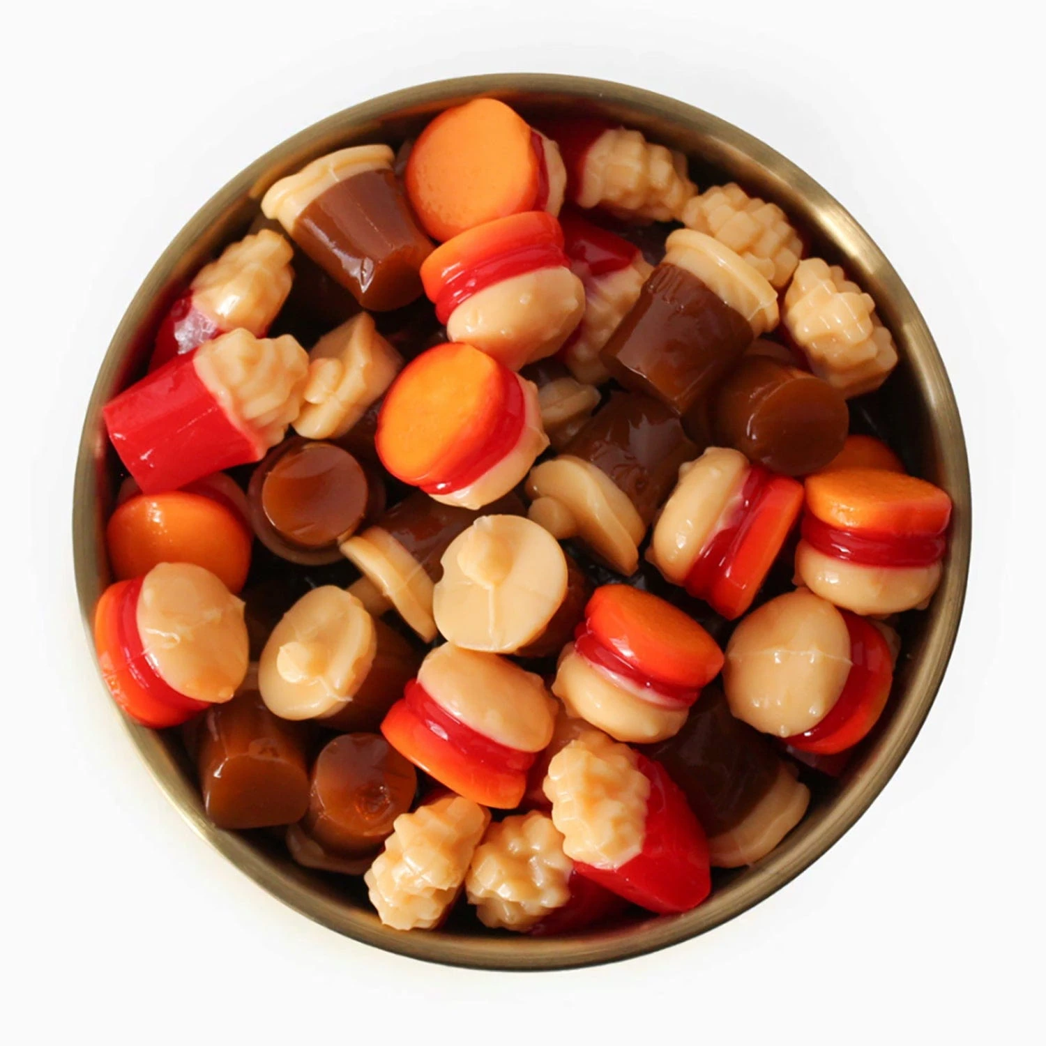 Ultra-realistic 3D gummies in classic fast-food shapes. Chewy, two tone gummy burgers, fries and sodas. No clowning around here.