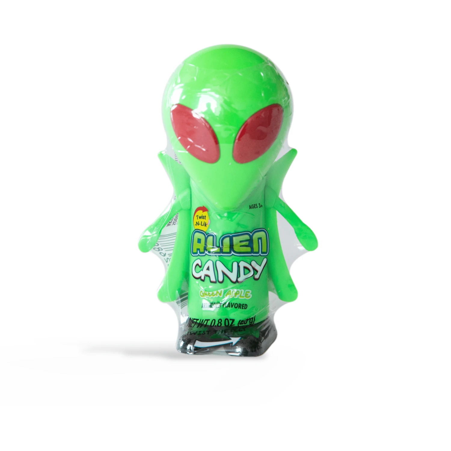 These are some tasty aliens! Just twist off the head and lick the out-of-this-world fruit-flavored slime candy that comes out. Three possible flavors: Blue Raspberry, Strawberry & Green Apple.