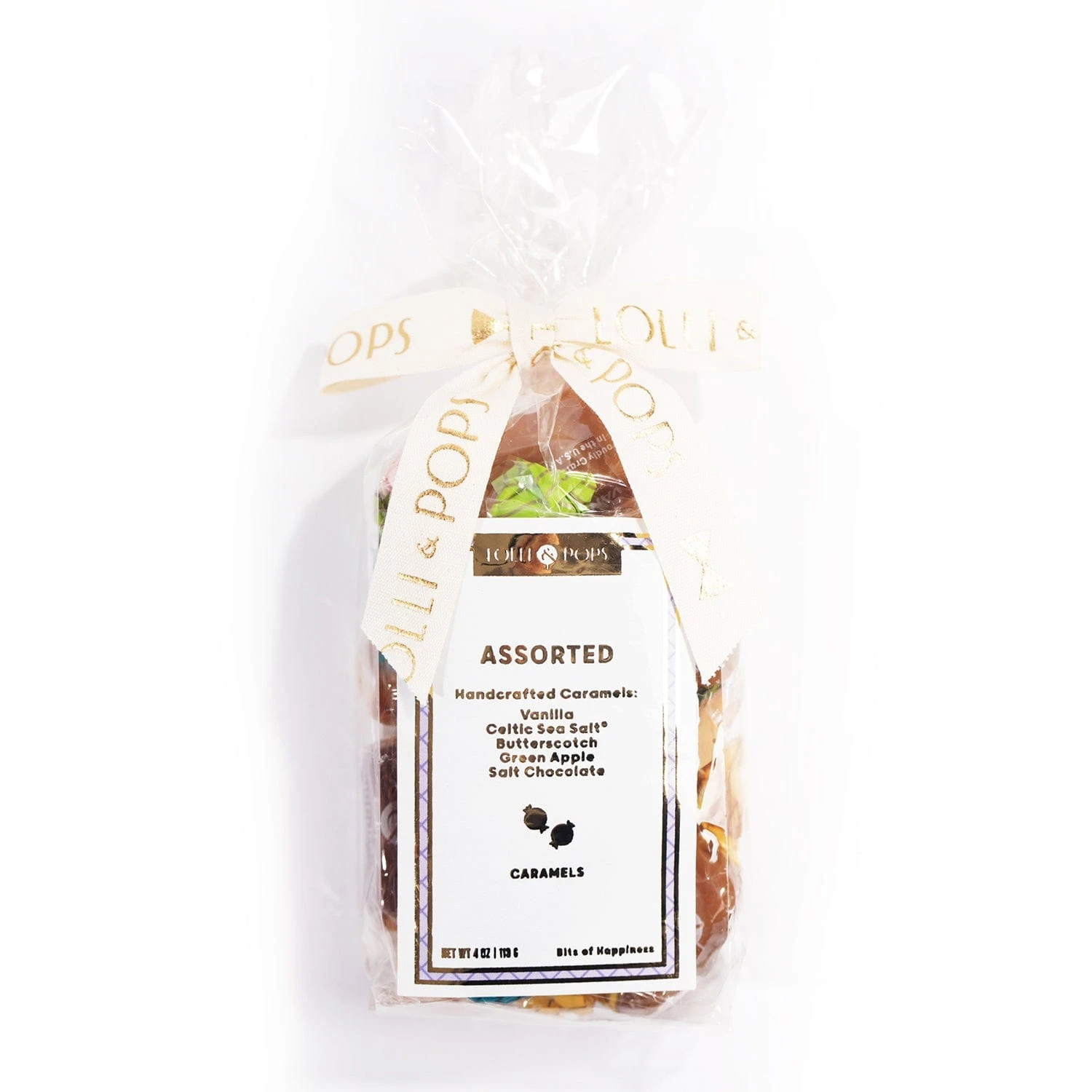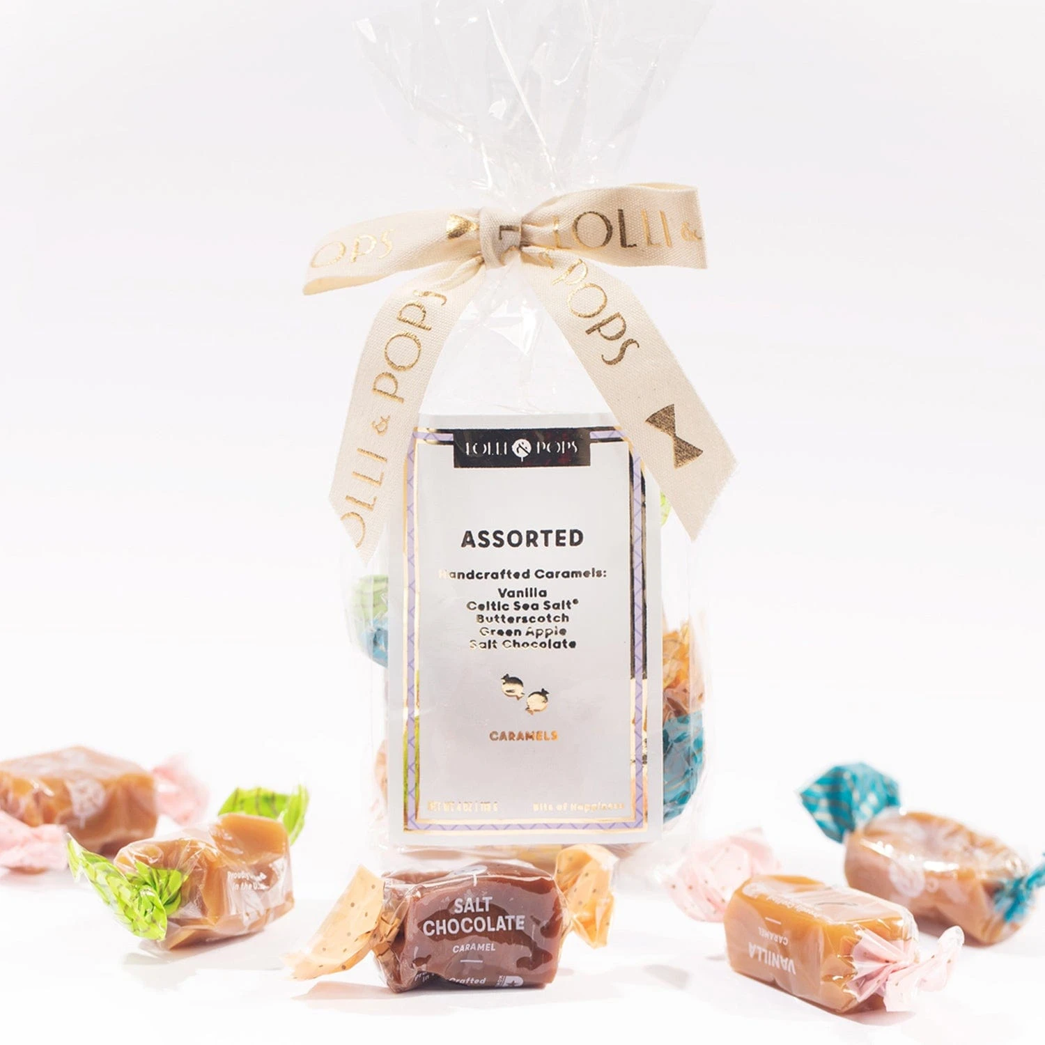 4 ounces of individually wrapped, assorted caramels. Perfectly soft and chewy. Flavors include Butterscotch, Salted Chocolate, Celtic Sea Salt, Green Apple & Vanilla.