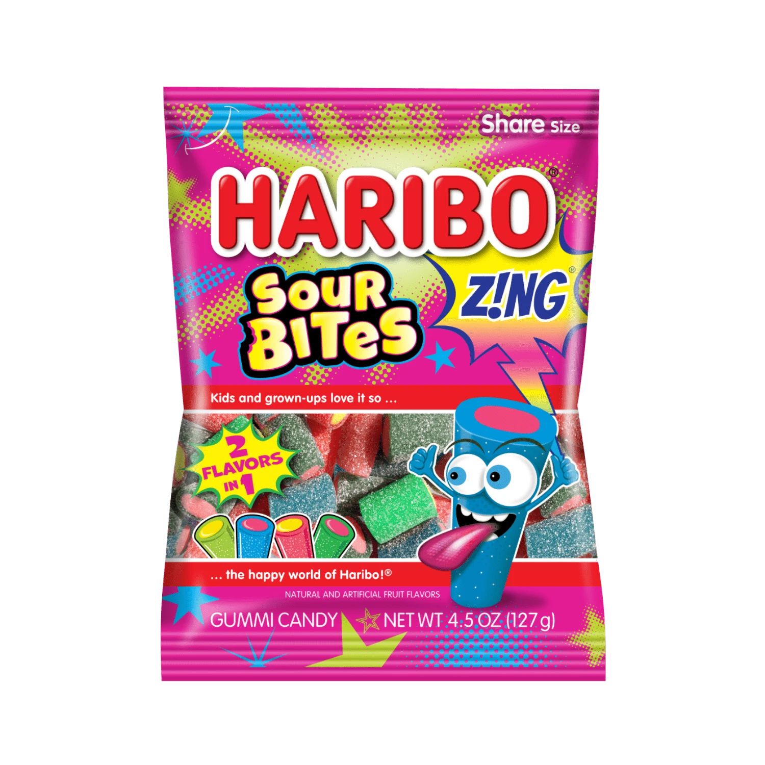 These Haribo Zing sour bites are more bang for your buck with two flavors in each sour vessel! Flavor combinations include strawberry lemon, lime lemon, watermelon red raspberry, and blue raspberry red raspberry. Don’t be fooled by these sweet flavors, these soft and chewy candy pieces pack a powerful sour punch!