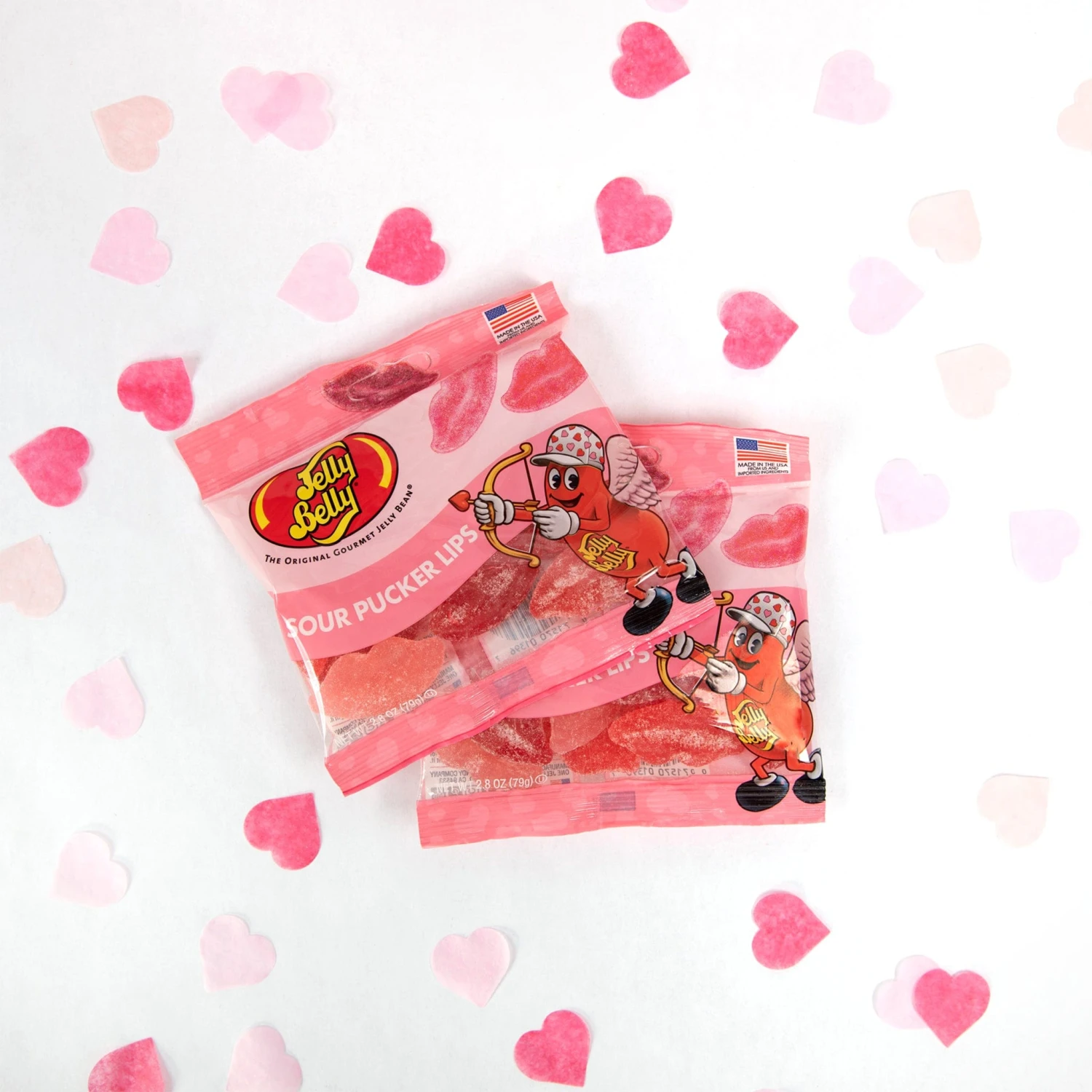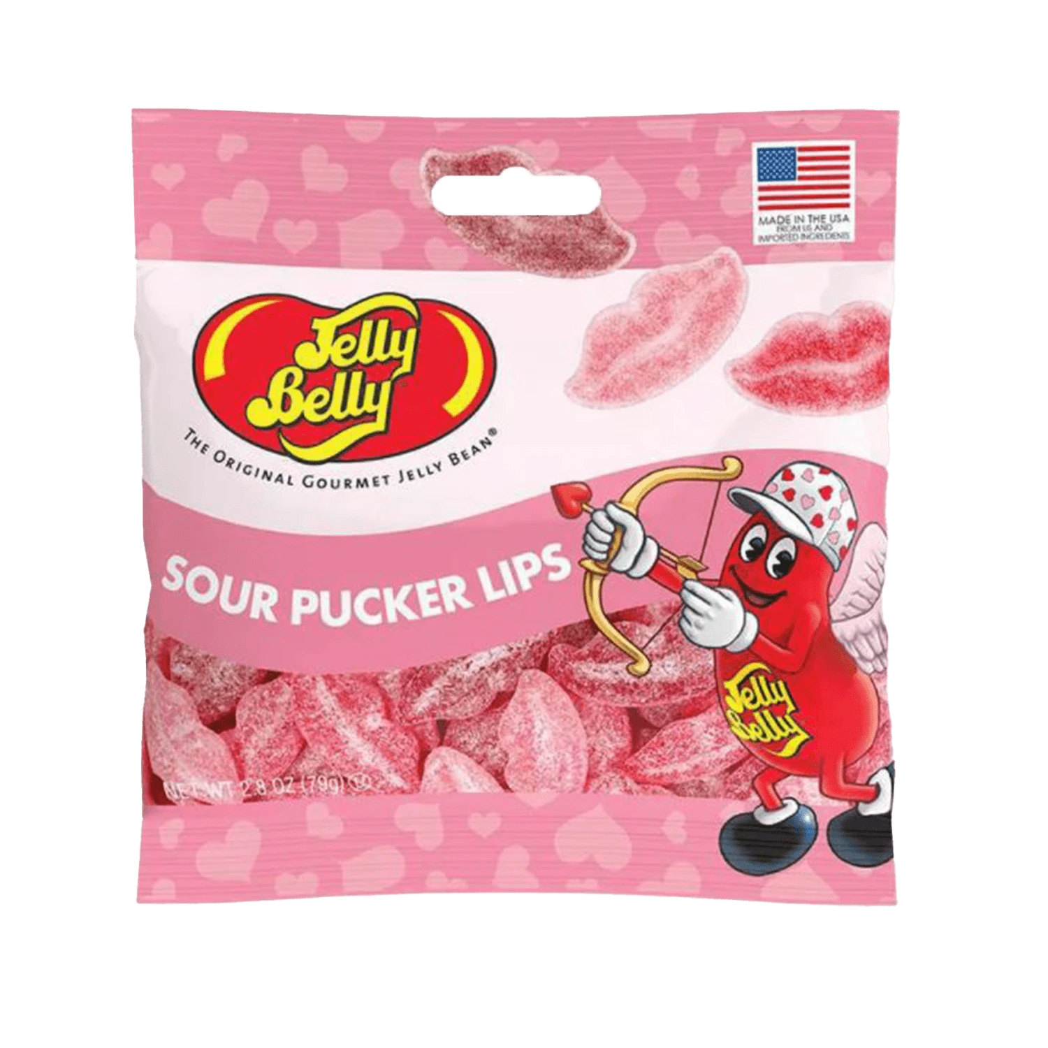 Jelly Belly’s Sour Pucker Lips are cherry, watermelon, and strawberry-flavored heart-shaped lips, dusted with sour powder. Sweet and juicy, just like the perfect kiss.