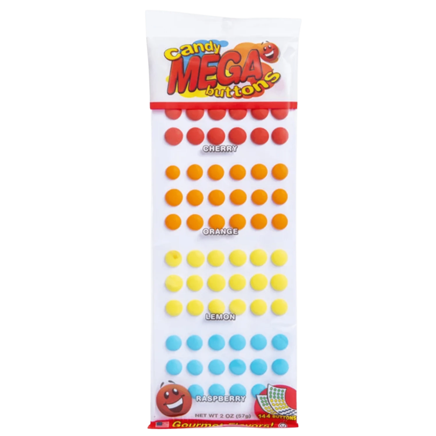 A favorite old-fashioned candy favorite is back and bigger than ever, with Mega Candy Buttons. Sweet candy buttons are attached to the traditional paper backing with 2 sheets (144 buttons) per package, and come in 4 colorful flavors: cherry (red), orange (orange), lemon (yellow), and raspberry (blue).