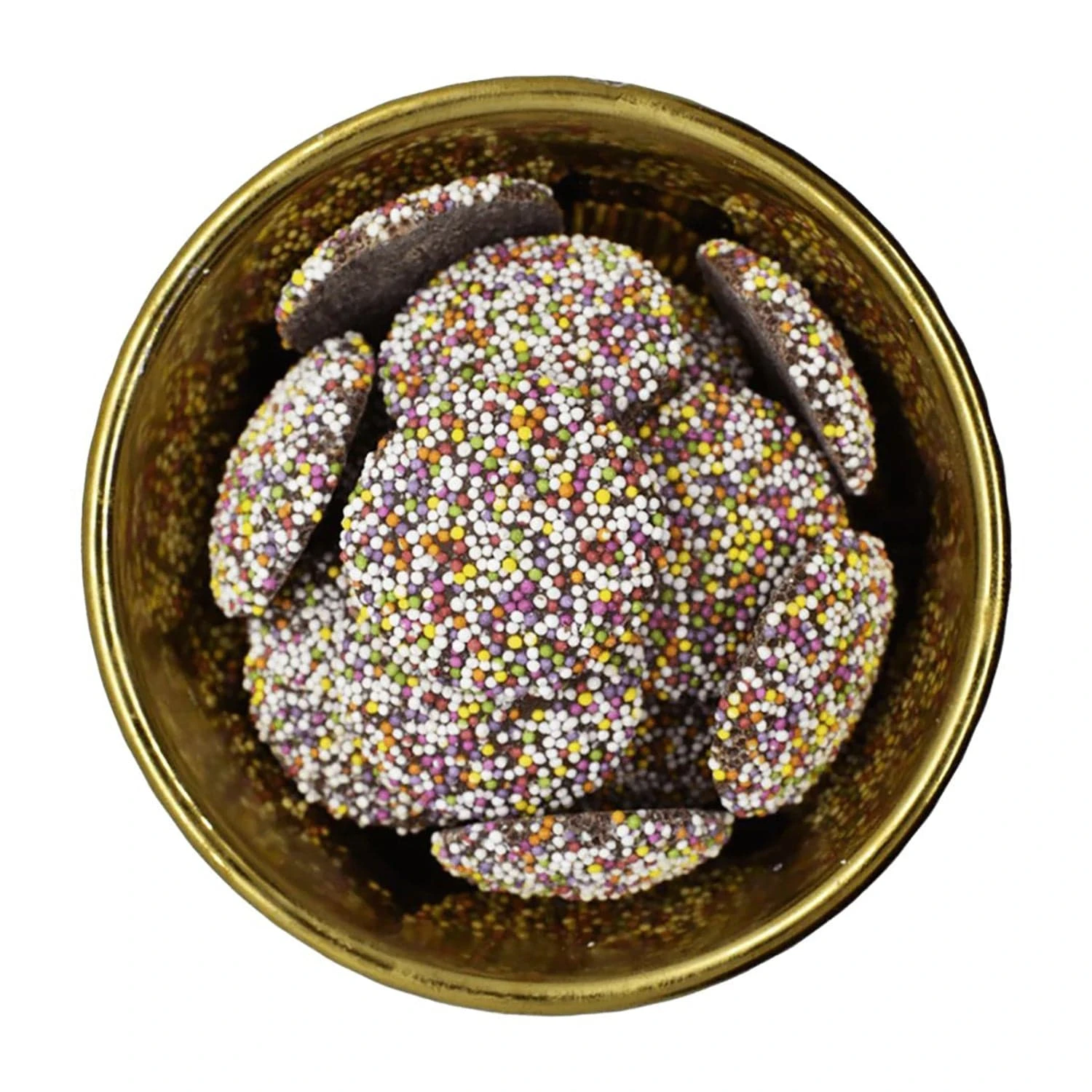 An excellent choice for snacking or putting the perfect finishing touch on gourmet pastry creations, these milk chocolate nonpareils with rainbow seeds deliver a rich cocoa taste topped with colorful sprinkles.