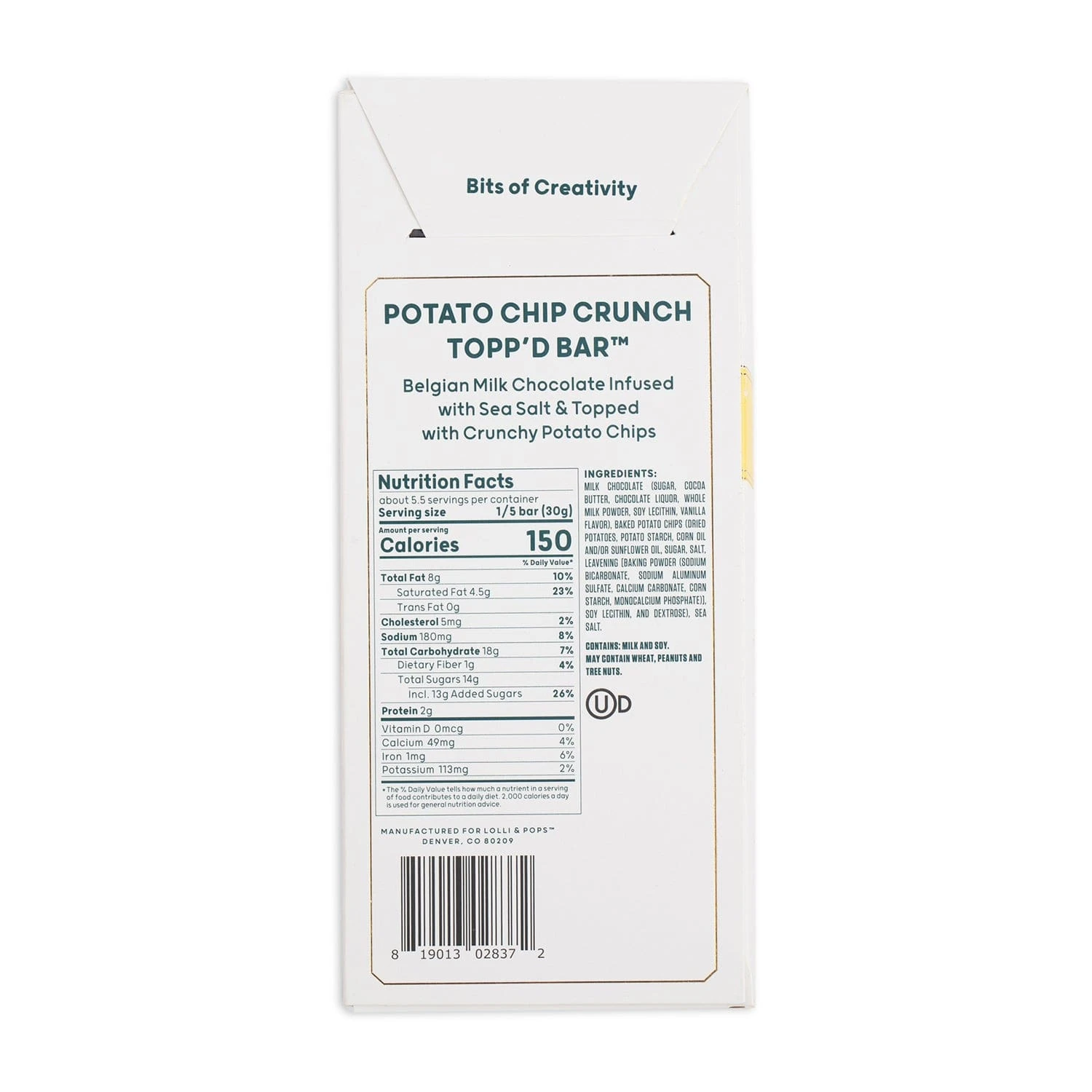 Belgian Milk Chocolate Infused with Sea Salt & Topped with Crunchy Potato Chips.