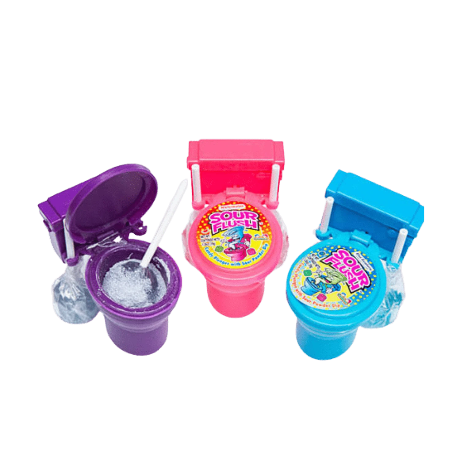 These Sour Flush candies aren’t something you see everyday! Plunge your lollipop sucker into the candy toilet and grab all the sour powder your heart desires. This is toilet that is socially acceptable to eat out of! Flavors include: Watermelon, Grape and Blue Raspberry.*